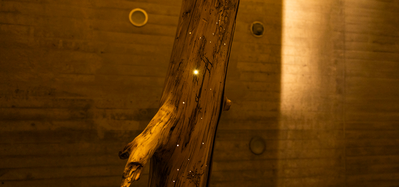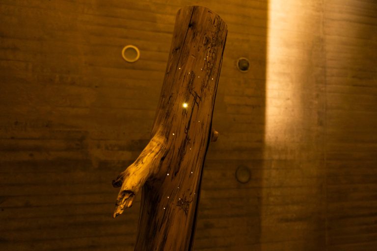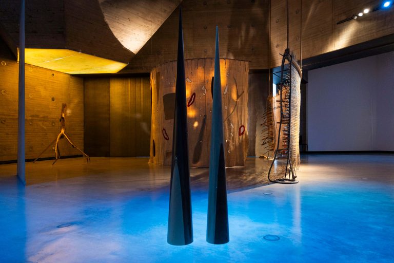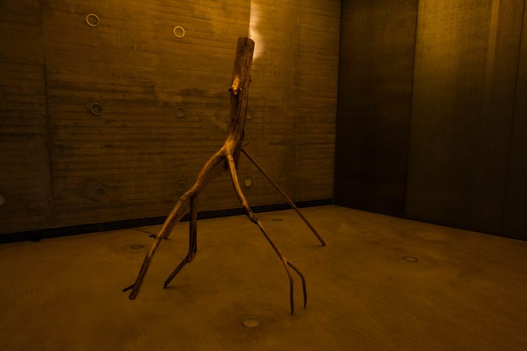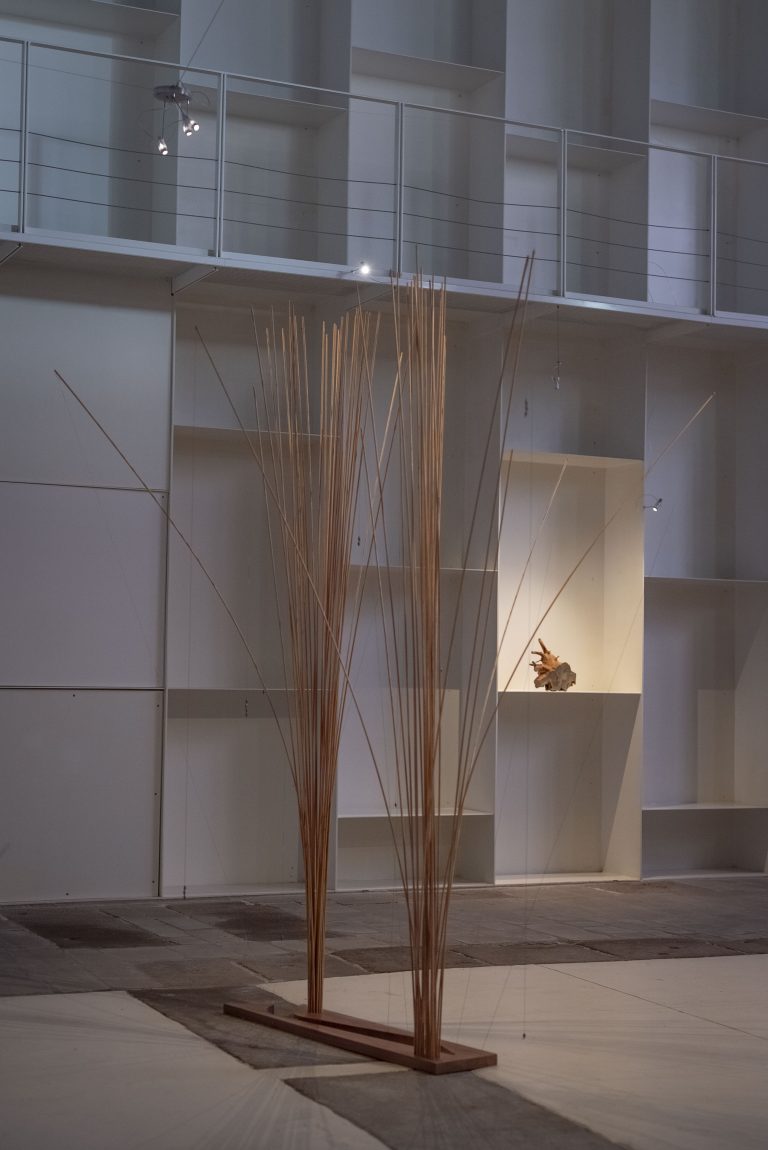 Instalación basada en estructuras verticales y elementos naturales. La obra sugiere una lectura poética del tiempo y el espacio a través del cuerpo.