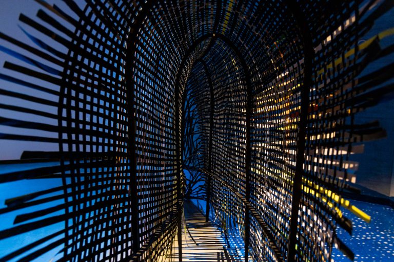 Instalación envolvente construida con materiales sonoros y lumínicos. El tejido manual genera una atmósfera inmersiva vinculada a la memoria oral.